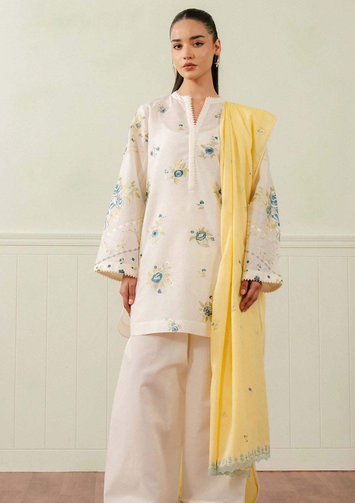 A soft vanilla base highlighted by subtle floral embroidery and a sunlit yellow dupatta, creating a captivating appeal.