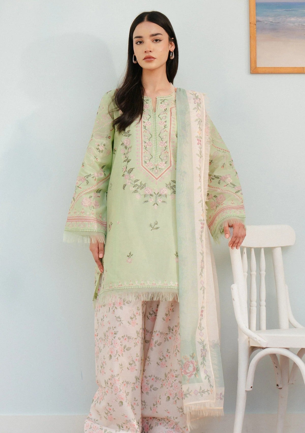 A pistachio green ensemble featuring floral embroidery, complemented by printed trousers and a statement dupatta for a refined, feminine look.
