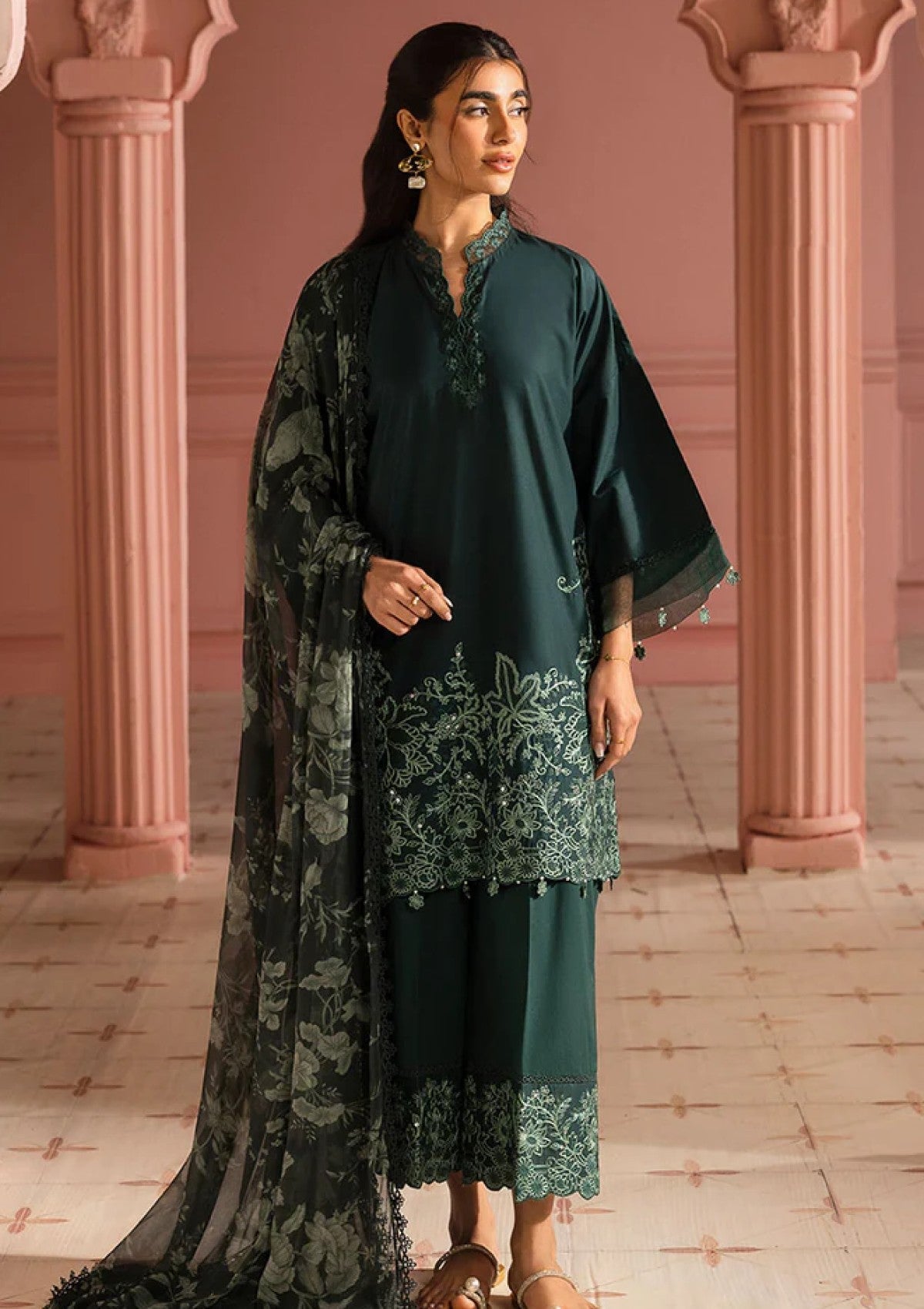 This Viridian Green 3pc Printed Lawn Suit boasts a beautifully embroidered front and sleeves on its lightweight lawn fabric. The dyed back and cambric trouser add to its elegant design. Complete the look with the chiffon printed dupatta. Experience style and comfort in one ensemble