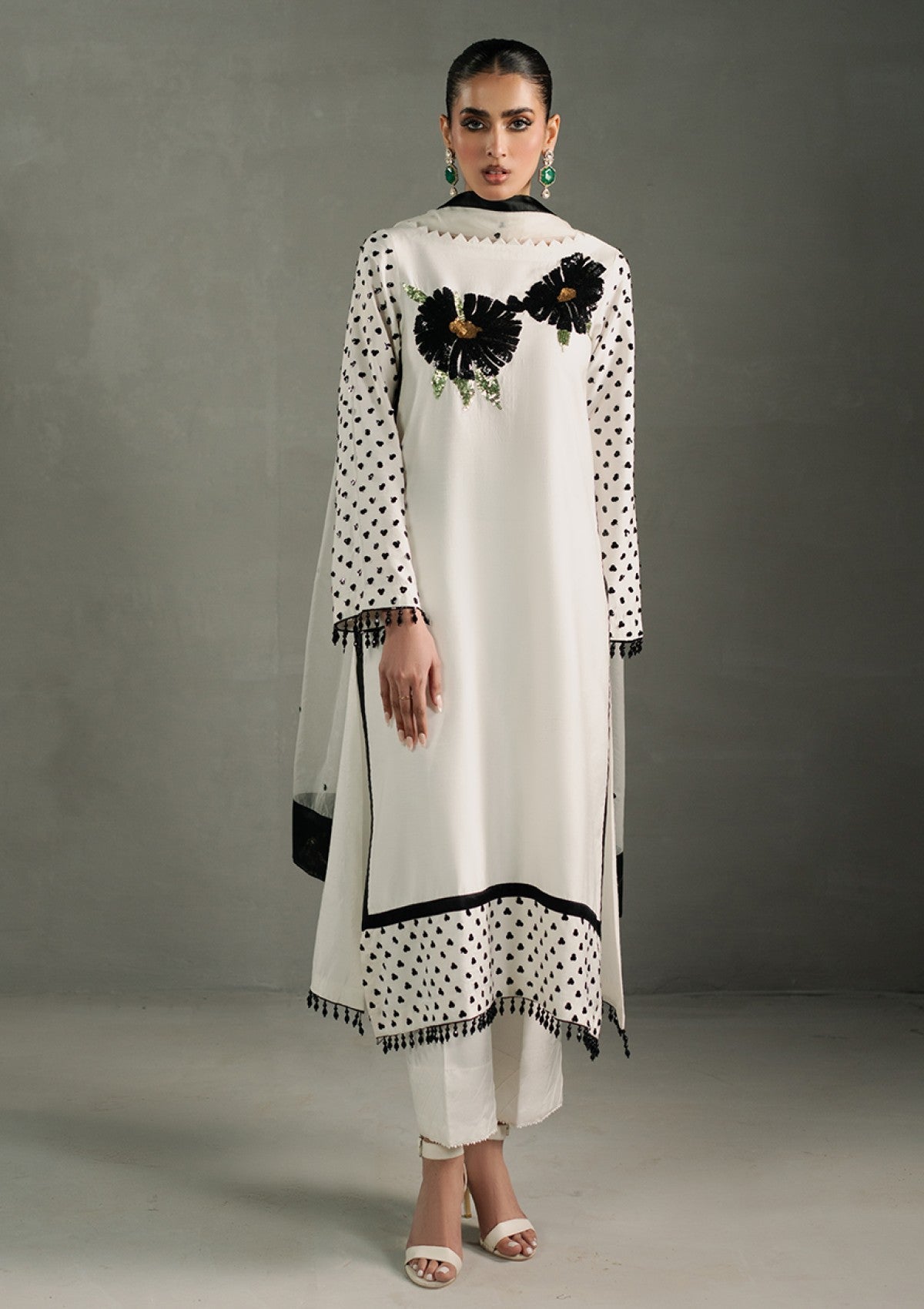 Embodying the spirit of minimalism, "ESTELLAA€ÂÂ, is a stunning example of refinement, crafted from a luxurious ivory raw silk fabric. The ensemble is enhanced by intricate ebony sequins embroidery, adding depth and elegance to its design. Paired with a dupatta featuring a four-sided silk border and delicate ebony sequins work, along with matching tonal trousers, this timeless creation effortlessly blends sophistication with enduring style.