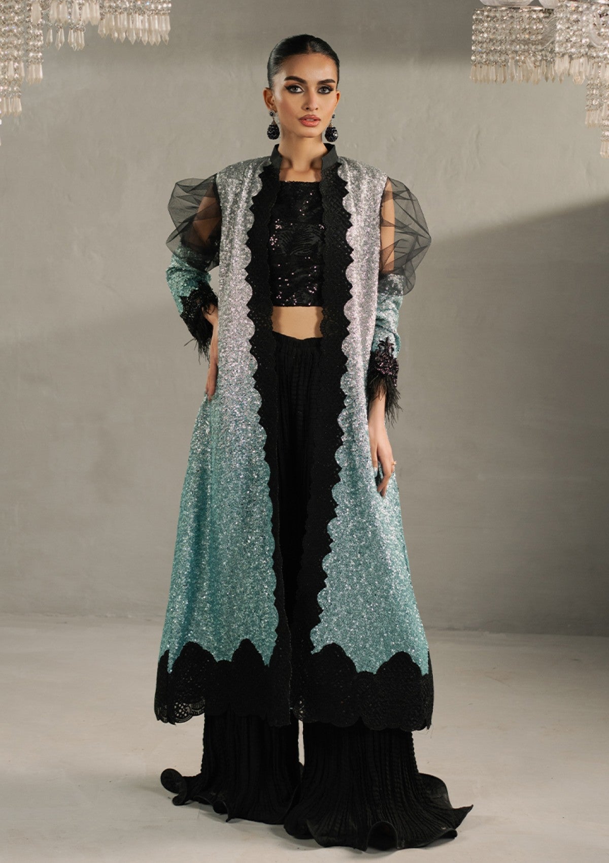 Presenting "MEIRAA€ÂÂ- a universally flattering design that epitomizes sophistication. This metallic, ombré shimmeryA A flowing, front-open jacket captures attention with its intricate craftsmanship and shimmering sequins that add a touch of allure, it is adorned with gleaming sequins that weave their enchanting spell across a sumptuous net canvas, while precious pearls accentuate the ensemble, creating a mesmerizing composition. Layered over exquisitely tailored crushed sharara pants, this glistening vision of beauty is perfect for making a lasting impression with its glamorous allure and timeless elegance.