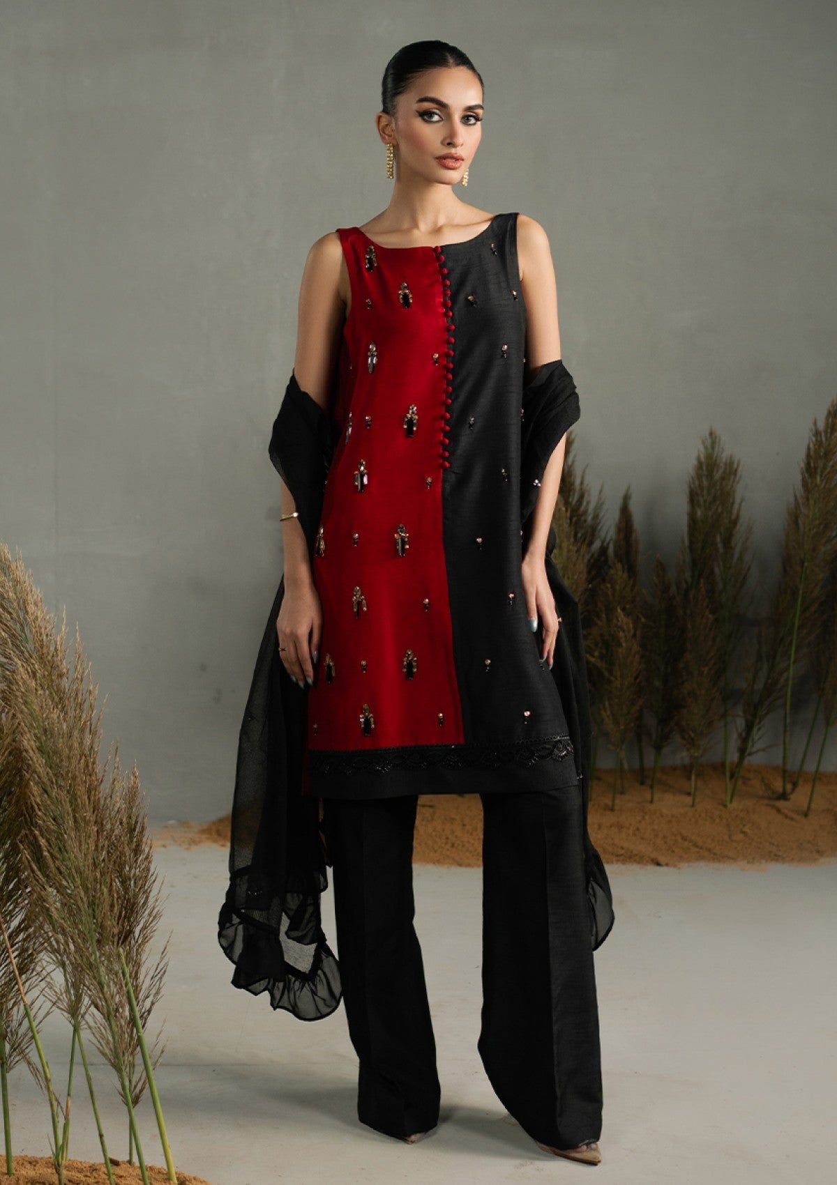 Presented in a captivating shade of haute red and onyx black color block shirt captures the essence of opulence with silk frosted fabric. The hand-embellished shirt, resplendent with sequins and iridescent crystals, demonstrates exquisite craftsmanship. Accompanied by a delicate cotton net dupatta sprinkled with sequins and a tonal tailored boot cut pants creating a mesmerizing composition. Embodying refined sophistication for any formal affair or joyous celebration.