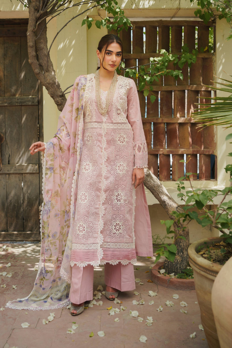 Rozay, a captivating ensemble, exhibits the dusty pink kameez crafted with beautiful cutwork detailied lace on the shirt yoke. Its lower panel dazzles with schiffli cutwork embroidery and coordinating lace patches, accented by three distinct lace inserts for a harmonious fusion of style. Delicate schiffli cutwork sleeves add a refined touch, while plain pants and a digitally printed dupatta complete this exquisite outfit.